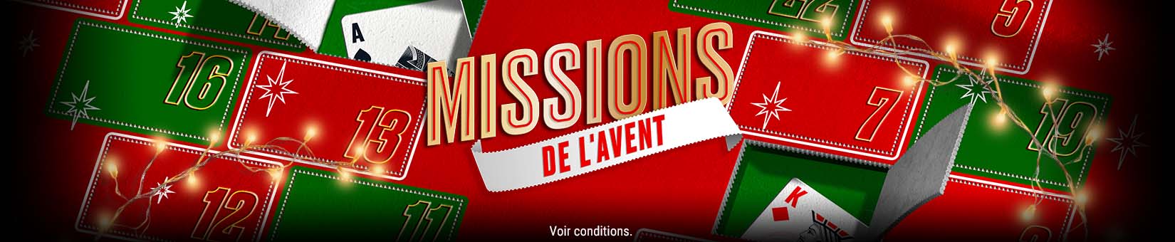 Les joueurs qui participent à l’offre Missions de l’Avent et qui complètent les défis poker quotidiens peuvent gagner des récompenses quotidiennes aléatoires, d’une valeur pouvant atteindre 9 300 € chaque jour.