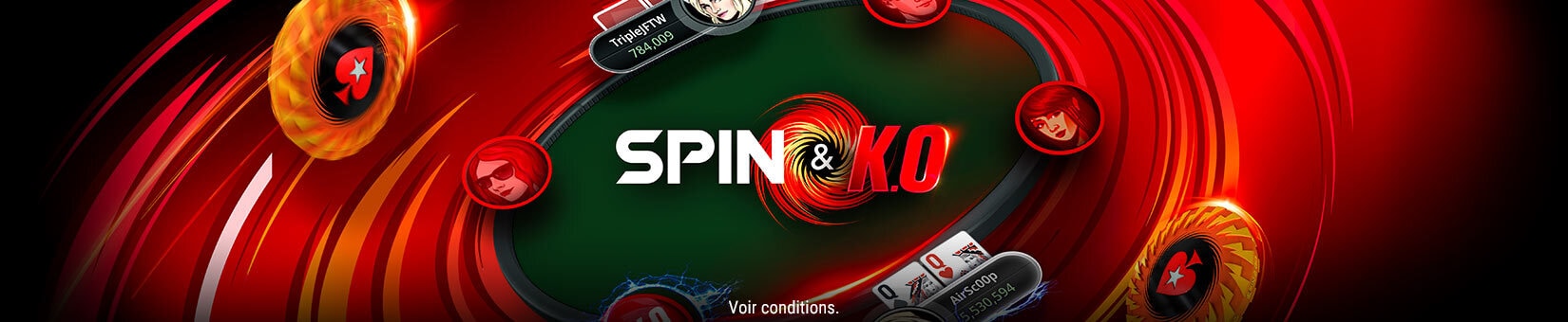 Il vous suffit de vous inscrire une seule fois puis d'éliminer le nombre d'adversaires requis lors de tournois Spin & Go de même buy-in. Après chaque élimination, nous vous assignerons un score aléatoire compris entre 1 et 5 000, qui déterminera votre place au Classement Spin & KO quotidien pour ce buy-in.